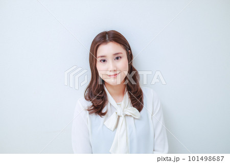 白いブラウスを着た笑顔の若い女性
