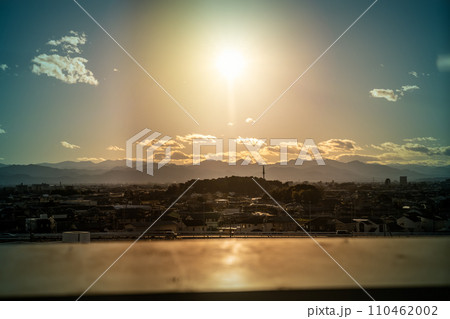 大阪市、中央区、谷町筋の夕暮れ時、タワーマンションから望む大阪の黄昏時の風景、オレンジ色の夕日