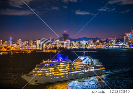 日本の横浜都市景観 新風景。2隻競演…三井オーシャンフジや関内駅方向(再開発)、ワールド号などを望む