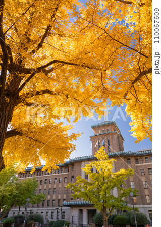 《神奈川県》横浜日本大通り・キングの塔と黄葉のイチョウ並木
