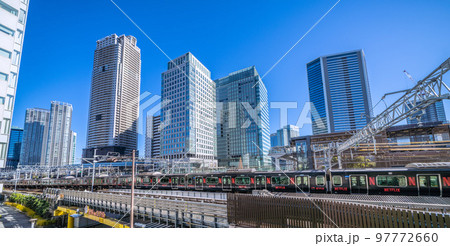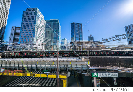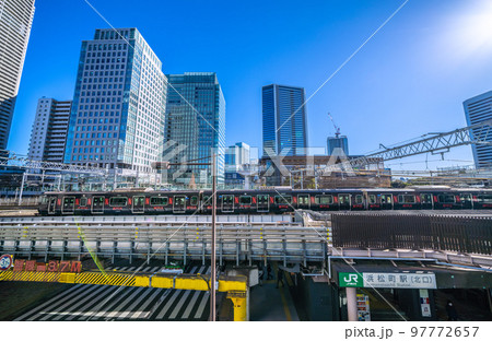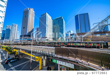 日本の東京都市景観 浜松町駅を発車した黒い山手線(内回り)や超高層ビル群などを望む