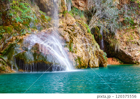 Serene Waterfall Cascading Into a Turquoise Pool Amid Rocky Cliffs in a Tranquil Nature Setting