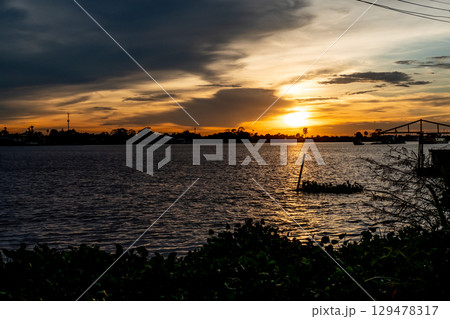 Sunset sky with the silhouette of riverside building