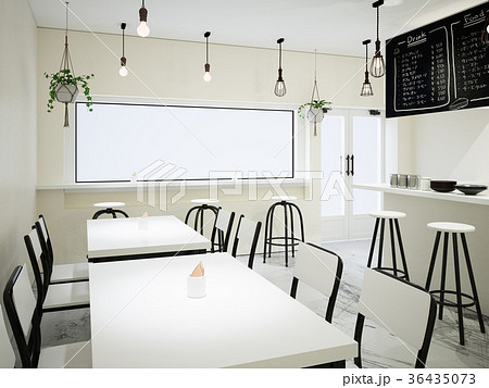 Modern coffee shop interior with white tiled walls, bar counter with brewing equipment, 3d rendering