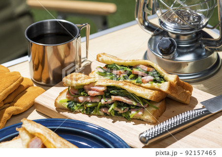ほうれん草とベーコンを挟んだホットサンドのキャンプ飯