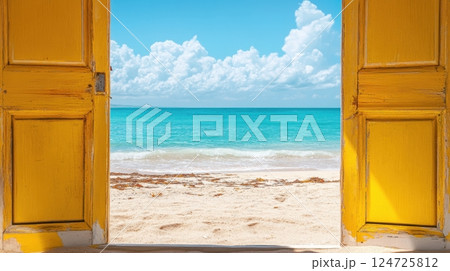 A pair of vibrant yellow doors open to reveal a breathtaking view of a turquoise ocean