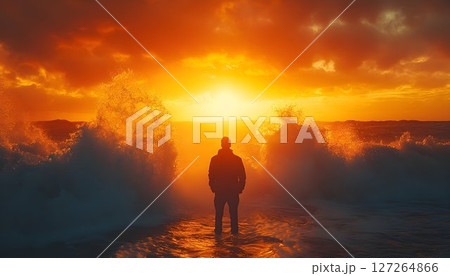 Silhouette of person standing in ocean during a vibrant fiery sunset
