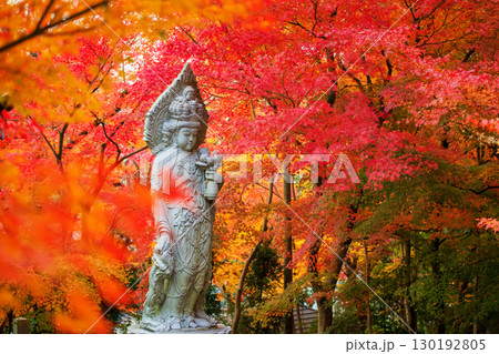 Guanyin statue by autumn maple leaf at Eikando garden, Kyoto