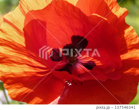 Summer in garden, red common oriental poppy or Papaver orientale flower plant blooming outdoors.