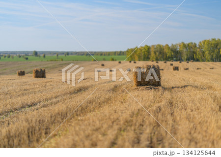 A Serene Golden Field Displaying Bales of Hay Beneath a Beautiful and Bright Sky Above