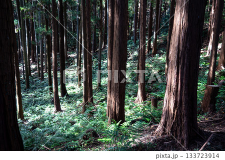 光と影が織りなす杉の人工林:埼玉県日高市・日和田山のうっそうとした森