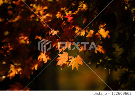 朝日に照らされて浮かび上がる紅葉(もみじ)