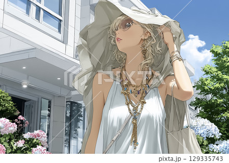 熱中症対策として帽子をかぶって涼しげに歩く女性のイラスト素材