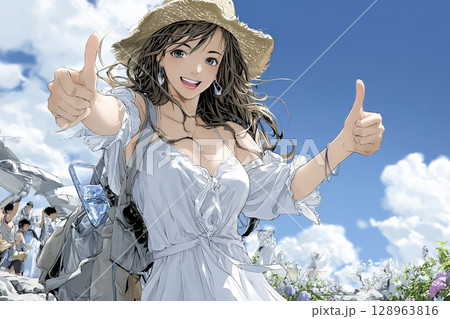 熱中症対策として麦わら帽子をかぶってグッドサインをする女性のイラスト素材