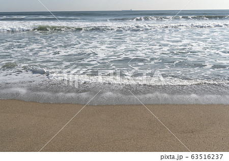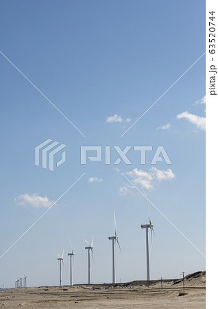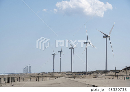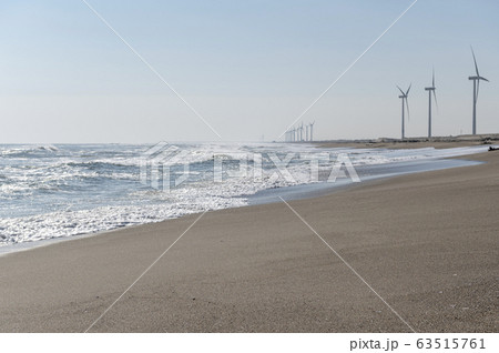 風力発電のある砂浜(茨城県日川浜海水浴場)