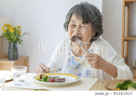 ステーキを食べるシニアの女性