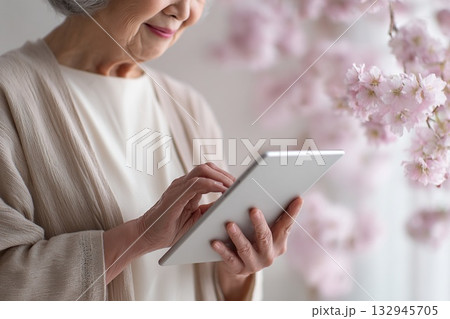 タブレットを操作する高齢女性の手元と桜のある暮らし(室内・自然光)