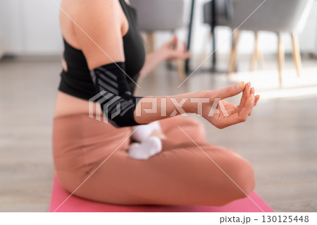 Close up view of middle aged woman sitting cross legged in lotus pose on pink yoga mat in modern apartment, focusing on yoga and flexibility