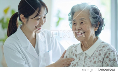 介護士に優しく支えられる高齢女性