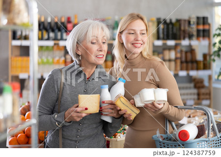 Two women shopper with various dairy products in her hands continues to make choice in grocery department of supermarket