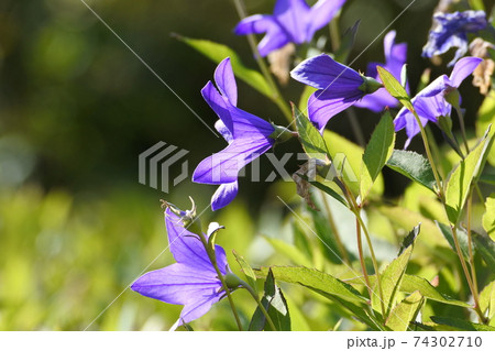 キキョウ 明るい陽射しの中に咲く複数の花 横向きの写真