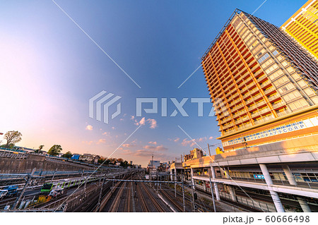 日本の東京都市景観 夕日を浴びる日暮里駅前のタワーマンションなどを望む