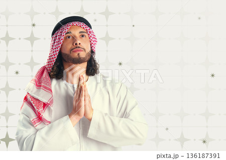 Man praying during Ramadan while wearing traditional clothing and looking upwards