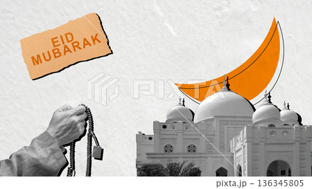 Eid Mubarak celebration elements, including a mosque, crescent moon, a hand holding prayer beads, and a torn paper banner with the greeting "Eid Mubarak". Eid al-Fitr or Islamic background