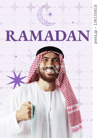 Ramadan celebration with a man holding prayer beads and smiling during the holy month