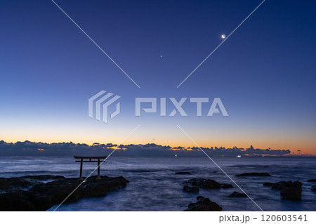 伊豆下田のマジックアワーに浮かぶの三日月と爪木崎灯台の絶景