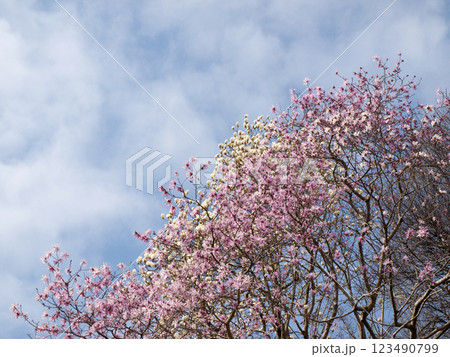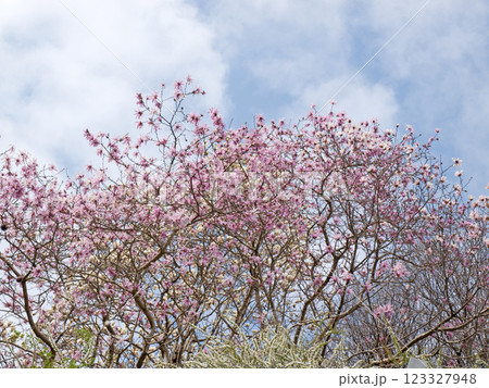 春空に映える満開の紅辛夷(ベニコブシ)別名 姫四手辛夷(ヒメシデコブシ)