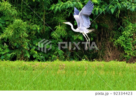 2021日本で一番幸せな町に選ばれた鳩山町の緑が綺麗な水田から翼を大きく広げ舞い上がったアオサギ