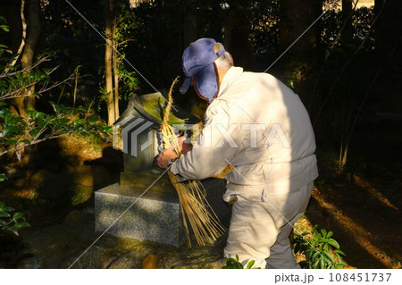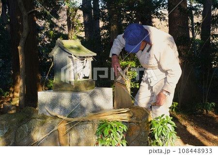 2023日本で一番幸せな鳩山町の農民が屋敷稲荷の正月準備でしめ縄の交換をしている光景