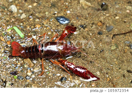 鳩山町坊田沼下流に生息する珍しいアルビノのザリガニと普通のザリガニの生態写真
