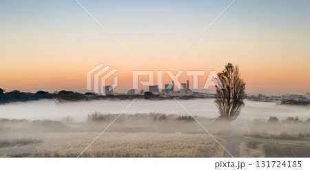 空撮「埼玉県」霧が立ち込める早朝の見沼田んぼ 秋