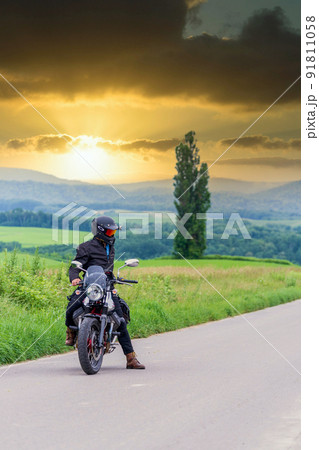 「北海道」美瑛の丘で夕陽をバックに佇むライダー