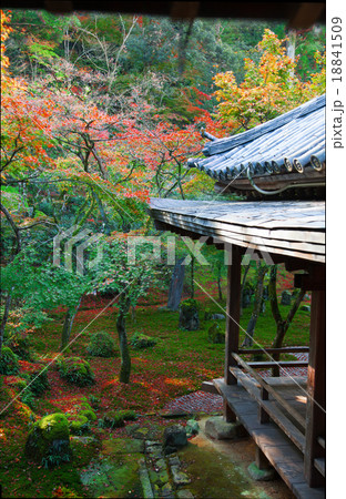 日本庭園の紅葉 苔 モミジ 瓦屋屋根