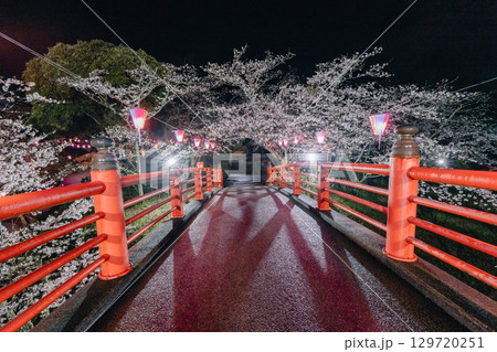 小見川城山公園の夜桜と赤い橋のライトアップ