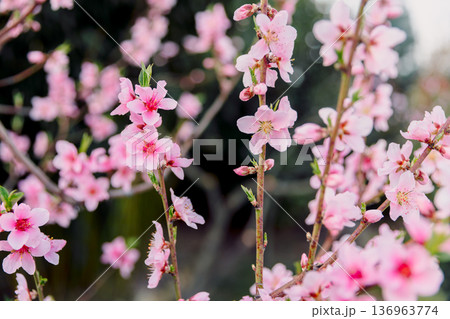 Peach blossoms in full bloom, delicate flowers on branches. Spring time romantic scene.