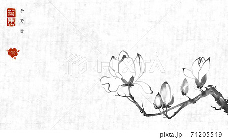 Magnolia flowers on vintage rice paper background. Traditional oriental ink painting sumi-e, u-sin, go-hua. Translation of hieroglyphs - peace, tranquility, clarity