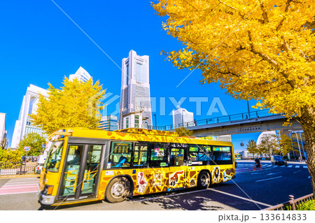 日本の横浜都市景観 横浜市営バス・桜木町駅前市役所口から、あかいくつ、横浜市役所などを望む