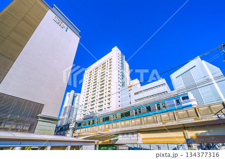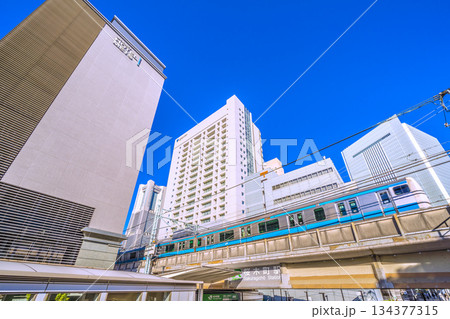 日本の東京都市景観 浜松町駅前の世界貿易センタービルディング南館や電車などを望む