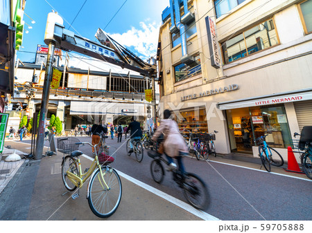 日本の東京都市景観 路上放置自転車。自転車が氾濫する「東急電鉄 学芸大学駅」前・西口商店街
