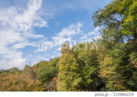 青空に映えるアメリカフウの紅葉:紅葉楓:山田池公園