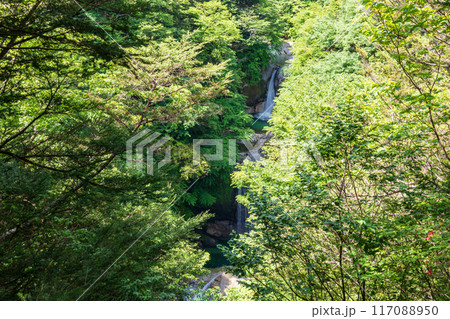 空撮「山梨県」新緑の尾白川渓谷・神蛇滝 北杜市