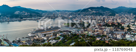 長崎港客船入港(Adora Magic City)鍋冠山からの夕景 パノラマ【長崎市】