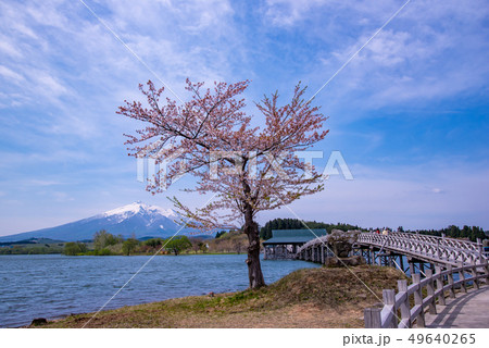 青森県 津軽 鶴の舞橋と桜 日本一の木造三連太鼓橋