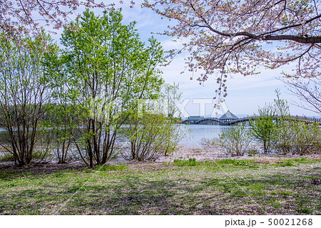 津軽富士見湖 鶴の舞橋とと桜(青森県北津軽郡鶴田町)