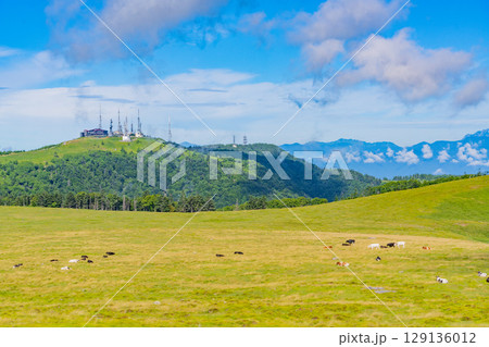 爽やかな皐月の空の下、草を食む放牧牛のいる美ヶ原高原