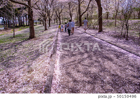 青森県 津軽 鶴の舞橋へ向かう家族連れ 桜吹雪の道